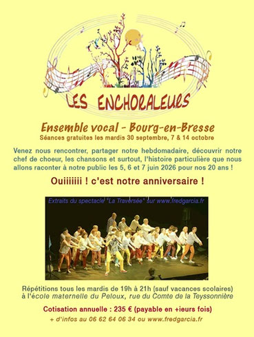 L'actualité des Enchoraleurs : via la Niouzeletter bimensuelle de Fred Garcia, l'Apidaé, le Portail des Associations de l'Ain et le site de la Corde Vocale.